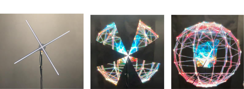 「回転型ディスプレイ」は、バーサライタ技術を使用しています。この技術では、高速回転するLEDバーが視覚的な残像を利用し、空中に映像や文字を浮かび上がらせます。 -視覚の仕組み: 特定のタイミングでLEDが点灯することで、動的または立体的な映像として認識されます。
