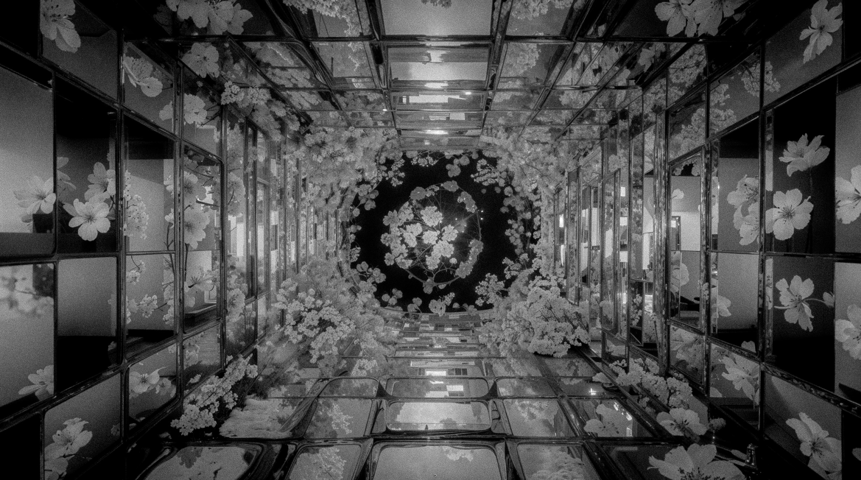 若い頃も一瞬で過ぎ去り、白髪頭の老年を迎える。人の営みは日々変わらないが時間は過ぎていき、人生もまた一炊の夢のようである。計算機自然における質量ない桜もまた質量のある桜との間を行き来し、その往来の中に人の人生や営みを連鎖させ続けている。本作品は環境と無限反射LEDミラーの様子をリアルタイムに生成AIで変換するとともに、計算機自然における共鳴する桜の姿を描き出す。